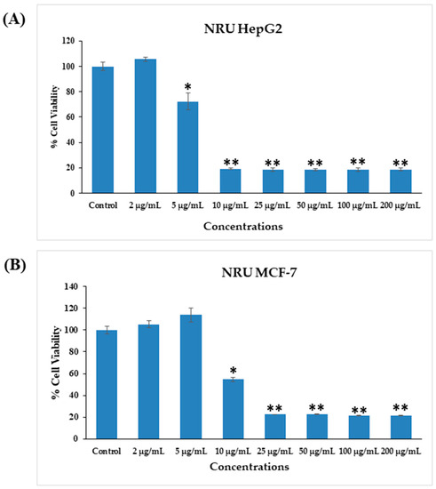 Cytotoxicity assessment by NRU assay in HepG2 (A) and MCF-7 (B) cells after exposure to different concentrations of AgNPs for 24 h. The values are the mean ± SE of three independent experiments. * p < 0.05, ** p < 0.01 vs. Control.