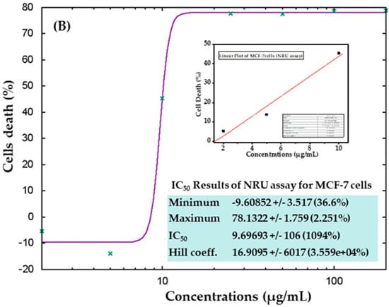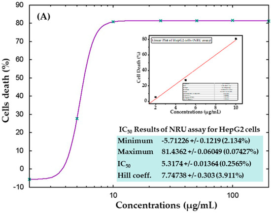 Lysosomal cytotoxicity assessment was also quantitated with and without AgNPs exposure via the neutral red uptake (NRU) assay as per the previously described protocol [60,61]. HepG2 and MCF-7 cells (1 × 104/well) were seeded in specific 96-well plates. Afterwards, the cells were treated with the desired concentrations (2, 5, 10, 25, 50, 100, and 200 µg/mL) of AgNPs and kept for 24 h in an incubator. After exposure, the cancer cells were further incubated in NR medium (50 µg/mL) for 3 h. Later, the cells were washed and the dye was extracted in 1% acetic acid and 50% ethanol solution and the color was read at 550 nm.