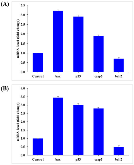 The mRNA levels of apoptotic marker genes, such as p53, bax, caspase-3, and bcl2, in HepG2 and MCF-7 cells were examined by qPCR after exposure to AgNPs (25 µg/mL) for 24 h. The obtained results demonstrated notable alterations in apoptotic marker genes in HepG2 and MCF-7 cells (Figure 11). Relative to the control, in HepG2 cells, bax, p53, and caspase-3 was upregulated by 3.2, 2.9, and 1.9 fold, while bcl2 was downregulated by 0.70 fold (Figure 11A). A similar trend was also observed in MCF-7 cells, in which bax, p53, and caspase-3 were upregulated by 3.5, 3.0, and 2.8 fold, respectively, and bcl2 was downregulated by 0.50 fold (Figure 11B).