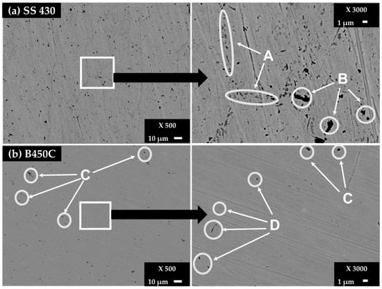 SEM images (×500) of surface steel control samples and zoom (×3000) of areas of interest: (a) SS 430 and (b) carbon steel B450C.