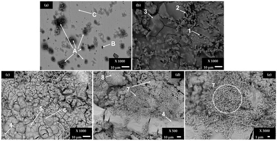 After the initial period of 7 days (Figure 2a), the surface is not completely covered by a corrosion layer and the EDS analysis reveals the crystals of CaCO3 (labeled as A), as well the particle of high Mn and C content (labeled as B), suggested as Mn3C phase [39,40]. On the area covered by the dense layer of corrosion products (Figure 2b), a variety of iron-oxide morphologies are observed, in the presence of Cu (zones 2 and 3, Table 5). At the end of 30 days (Figure 2c–e) of the experiment, the steel surface is covered completely by a dense layer, presenting micro- and macro-cracks. The iron corrosion products are usually composed by the phases of different oxides and hydroxides (α- β- and γ-FeOOH), presenting their own chemical and physical properties, as well as a lower density than that of the iron matrix; as they are voluminous, cracks occur. Zones 4 to 8 reveal the high contents of O and Fe, in the presence of chloride, more significantly in zone 7. According to studies, the morphology of iron corrosion products changes in the time, attributed to different phases: sandy crystals, crystalline globules or fine plates look alike to the morphology of γ-FeOOH (lepidocrocite), while the Fe3O4 magnetite phase is represented by the rods of different sizes and dark flat regions with circular disks. The α-FeOOH goethite grows in globular structure (known as cotton balls) [50,51,52,53,54,55,56]. It was also reported that some iron products grow as staggered filaments (filiform corrosion), as observed in zone 7 (Figure 2d,e), extending radially from the chloride-rich zone (more active in corrosion) to the poorer zone [54].