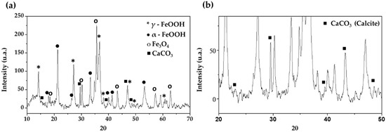 The EDS elemental analysis was collaborated with XRD spectra (Figure 3) analysis, which revealed that the main corrosion products formed on the B450C carbon steel surface (after exposure for 30 days) are γ-FeOOH (lepidocrocite), α-FeOOH (goethite), magnetite (Fe3O4) and, at lower intensity, crystals of CaCO3 (calcite) appear (Figure 3b).