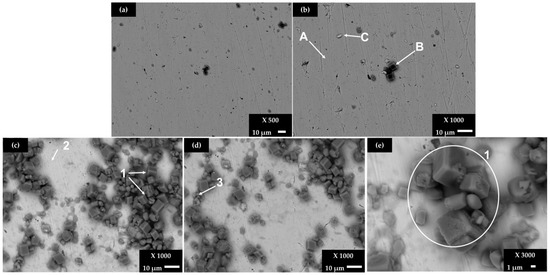 Carbon steel B450C control samples present black dots in two zones, named C and D (Figure 1b). The C zones, according to their EDS analysis (Table 2), contain Carbon (5.02%), Mn (1.31%) and a lower content of S (0.38), which may be considered as a part of the phases of MnS and Mn3C reported for this type of steel [39,40]. The existence of Cu may be attributed to the quality of the scrap used to produce this carbon steel [40]. The content of Si (6.46%), in the presence of Carbon (8.49%) in the D zone, was attributed to the SiC phase (Figure 1b, Table 2). Manganese and silicon are always present in carbon steel, although not explicitly reported by the supplier.
