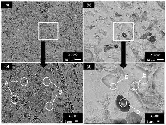 SEM images (×1000) of steel surfaces after removal of corrosion layers formed during exposure to chloride-containing cement extract solution for 720 h (30 days): (a) SS 430 and (b) zoom (×3000); (c) B450C and (d) zoom (×3000).