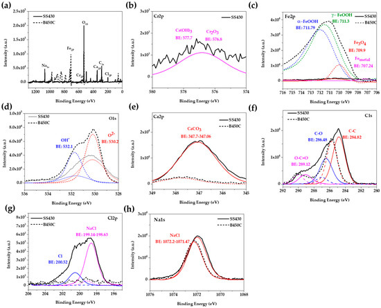 Overview of X-ray photoelectron spectroscopy (XPS) spectra acquired from SS 430 and carbon steel B450C after exposure to cement extract solution (+5 g L−1 NaCl) for 30 days: (a) full spectrum; spectrum for (b) Cr2p; (c) Fe2p; (d) O1s; (e) Ca2p; (f) C1s; (g) Cl2p and (h) Na1s.
