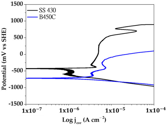 Potentiodynamic polarization curves of SS 430 stainless steel and B450C carbon steel exposed to the cement extract solution (+5.0 g L−1 NaCl).