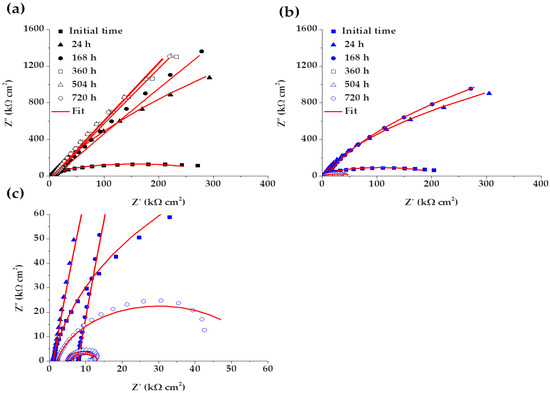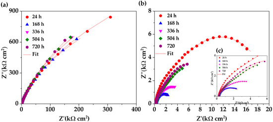EIS Nyquist diagrams with a respective fitting line for SS 430 and carbon steel B450C after different times of immersion in cement extract solution: (a) SS 430, (b) B450C and (c) zoom of B450C (b) diagram [34].