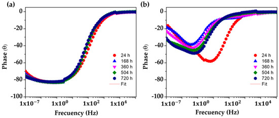EIS Bode diagrams with a phase angle with a respective fitting line for SS 430 and carbon steel B450C after different times of immersion in cement extract solution (+5 g L−1 NaCl): (a) SS 430, (b) B450C.