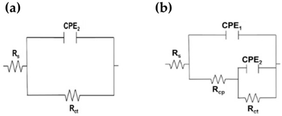 For a quantitative analysis of EIS results, two equivalent electrical circuit (EC) (Figure 11) have been widely used for the characterization of the electrochemical performance of stainless steels and reinforcing steel exposed to a concrete-simulated pore solution in the literature [78,79]. The first EC (Figure 11a) is a simplified Randles circuit (Figure 11a), describing the electrochemical reactions of metals presenting a passive state (with only one time constant), for example, on a stainless steel surface or on carbon steel in alkaline solutions [80,81,82]. In this EC, the Rs is the solution resistance at the electrode/electrolyte interface, Rct is the charge transfer resistance and CPE2 is the double-layer capacitance of the interface [83]. The time constant-phase element (CPE) was used instead of the ideal capacitance element, due to the rough and heterogeneous non-ideal surface of the electrode in aggressive environments [80]. Considering the degradation of passive films in the presence of aggressive ions (Cl−) and the possible corrosion attacks in local regions on the carbon steel surface, another EC (Figure 11b) with two time constants (instead of ideal capacitances) was used for fitting the EIS data for the B450C in the presence of chlorides (+5 g/L NaCl) [84,85,86,87]. The high-frequency time constant is connected with the defective external oxy-hydroxy Fe(III) layer formed at the interface steel-electrolyte, while the low-frequency time constant corresponds to the charge transfer process that occurred at the interface [72,73]. In this EC (Figure 11b), Rcp represents the resistance of defective passive films and CPE1 correspond to the passive film capacitance [83]. To obtain a better fit, capacitors may be replaced by constant phase elements (CPE), which have an exponential factor n, in the range from 0 to 1, where for an ideal capacitor n = 1 and n = 0 for an ideal resistor [57].