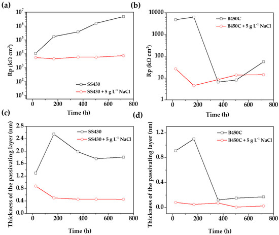 Looking for the answer for the effect of chlorides with respect to the electrochemical activities of both steels (the targets of this study), Figure 12 compares the evolution of Rp values and the passive layer thicknesses (d), corresponding to the SS 430 and carbon steel B450C, during their immersion in chloride-containing cement extract solution (this study) and in the absence of these aggressive ions [34]. In the absence of chlorides (Figure 12a) the Rp values of SS 430 tend to increase in time; even the pH of the solution decreases in alkalinity [34], as an indication of a stable passive layer on the steel surface. However, in the chloride-containing cement extract, the polarization resistance (Rp) values are relatively constant, being two-three orders of magnitude lower than those in the absence of chloride (Figure 12a).