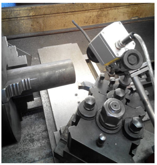 The experimental setup adopted during the dry finish turning tests of the Ti6Al4V cylindrical parts.