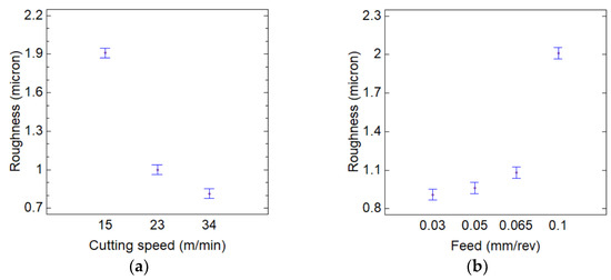 Means plots of the influences of the cutting speed and feed on the surface roughness: (a) roughness vs. cutting speed; (b) roughness vs. feed.