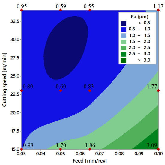 where v is the cutting speed (m/min) and f the feed (mm/rev). The coefficient of determination (R-squared), which is a statistical measure of how close the data are to the fitted regression line, was 96.2%. This equation was only valid within the process parameter ranges of Table 3; outside this range, the corresponding results were not supported by experimental data. The corresponding contour plot is shown in Figure 5 to point out the dependency of the surface roughness on cutting speed and feed. The graph confirms that better roughness values could be obtained with intermediate feed, while larger cutting speeds were required at increasing feed values. This result is consistent with previous studies on the dry machining of titanium alloys. According to Sun et al. [38], the tool nose curvature did not participate completely in cutting for a low feed rate of 0.05 mm/rev. Thus, the surface roughness initially decreased from about 1.1 to 0.9 μm (cutting speed of 60 m/min and cutting depth of 1 mm) with the feed rate increasing from 0.05 to 0.065 mm/rev. For higher feed, the high tool wear was considered to be the main cause for higher roughness values, with a roughness of about 1.4 μm at 0.1 mm/rev. Similar results have also been found in [42,43].