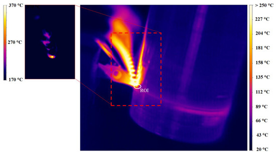 An IRtech mod. Radiamatic TImage Mk5 infrared (IR) thermal camera was used to measure the temperature field at the cutting region. The thermal camera was equipped with a thermal uncooled microbolometer sensor (focal plane array, FPA) with a 25 μm × 25 μm size. The noise equivalent temperature difference (NETD) was 0.08 °C, while the spectral range of detection was in the 7.5–13 μm interval. The frame rate of the thermal camera was 120 Hz and the resolution of the detector was 160 pixels × 120 pixels. The camera was equipped with a lens operating from 150 to 900 °C. The thermal camera was located close to the cutting region, as illustrated in Figure 2. The temperature field was recorded in steady-state condition to avoid transient temperature timespan at the beginning and the end of the cutting operation.