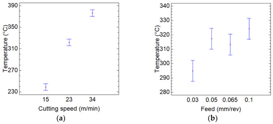 Means plots of the influences of the cutting speed and feed on the cutting temperature: (a) temperature vs. cutting speed; (b) temperature vs. feed.