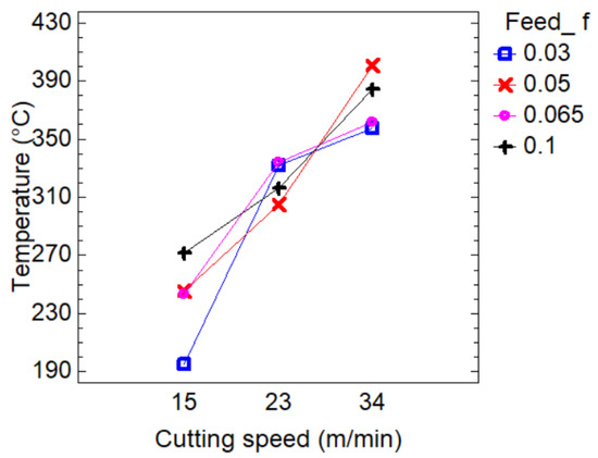 Interaction plot of the combined influence of cutting speed and feed on the cutting temperature.