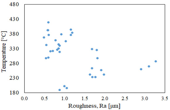 The scatterplot of Figure 10 depicts that the surface roughness improved with the cutting temperature. As previously discussed, this could be related to the softening of the material at higher temperatures and the absence of a build-up edge. From the examined data, the use of infrared thermography could be a useful tool to monitor the cutting process and, hence, to optimize machining parameters or to detect improper cutting conditions. This study is going to be extended to examine further cutting conditions in order to establish a strong model that could directly relate the cutting temperature to the surface roughness of Ti6Al4V under dry finishing turning.