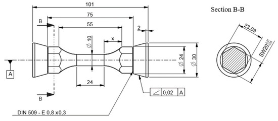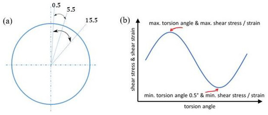 The resulting shear stress for each angle was determined from the maximum torque required to carry out the full rotational movement. According to Equation (2), is the shear stress, T is the torque and is the diameter of the smallest cross section of sample. The von Misses stresses were calculated using the von Misses equation (Equation (3)).