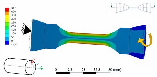 To obtain a clearer understanding of the load condition within the sample, an FEM calculation was conducted on ANSYS 2020 R1. The distribution of shear stress in a sample loaded at 350 MPa and in the position of maximum torsional angle of 7.5° is presented in Figure 4. In this model, the initial torsion of the sample in the first cycle is considered, neglecting effects of strain hardening and plastic deformation occurring with repeated loading in the real experiment. The highest value for shear stress is reached at the location where the thinnest cross section of sample can rotate least. This location lies on the constrained side of the sample, just before the thickness of cross section starts to increase again, as indicated by the arrow in Figure 4.