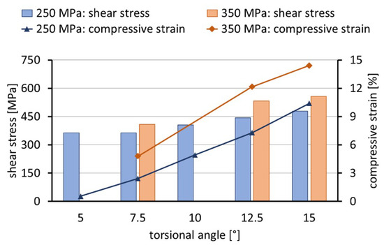 An overview of the applied test parameters and resulting maximum shear stresses measured during the first 120 cycles of each test are listed in Table 3 and presented in Figure 4. Calculated von Mises stress and the maximum compressive strain at the end of each experiment are also given. The compressive strain results from a shortening of the samples over the test time, are shown in detail in the following sections. Under 250 MPa compressive stress and 5° torsion angle the maximum shear stress measured for the sample is around 363 MPa (Table 3; Figure 4). Increasing the angle to 7.5° does not result to a shear stress increase. However, further increase to 10°, 12.5° and 15° results in an increase in shear stress in steps of around 50 MPa, 38 MPa and finally 34 MPa for each rise in torsional angle. It appears that the increment by which the shear stress increases becomes slightly smaller with increasing angle above 10°. Von Mises equivalent stresses at the maximum torsion angles, i.e., the maximum von Mises stresses, were also calculated for all load combinations tested, as listed in Table 3. Even for the lowest angle and compressive stress the resulting von Mises stress lies at 677 MPa which is relatively high in comparison to the tensile strength of the material (902 ± 1 MPa, measured on three samples). At 12.5° and 15° torsional angle under 350 MPa compressive stress, the calculated maximum von Mises stress lies well above the tensile strength (986 MPa and 1026 MPa, respectively). Expectedly, an increase of compressive stress leads to a higher von Mises stress level. Note that a difference of >100 MPa in von Mises stresses acts at the same torsional angle but different compressive stress, with a further increase of this difference for higher angles. Interestingly, under higher compressive stress more torque is required to reach the same degree of torsion, yielding higher shear stress (see Figure 5). The compressive strain at the end of each test increases with both compressive stress and torsion angle. The behaviour seems to depend almost linearly on the angle (see Figure 5). While at 5° torsion angle the axial strain is only 0.55%, it reaches a maximum value of 14.42% for the highest compressive stress and angle.
