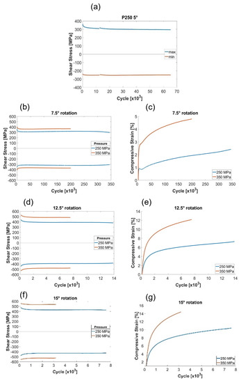 Evolution of shear stress and compressive strain over the duration of experiments for 250 MPa and 350 MPa compressive stress. (a) 250 MPa and 5°, (b,c) 7.5°, (d,e) 12.5° and (f,g) 15° torsional angle.
