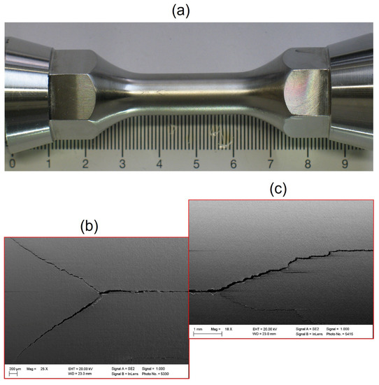 During the tests a rough surface forms on the previously polished samples due to plastic deformation of the material close to the outer surface. Most cracks observed on the outside of the specimen follow the longitudinal axis and remain within the test section. Occasionally, cracks on the sample surface branch and continue at an angle of about 20–35° to the specimen longitudinal axis (Figure 7).