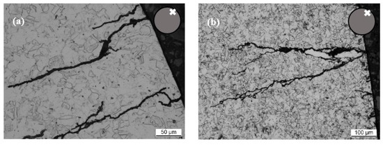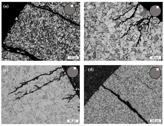 Figure 9 shows light microscopy images of cross sections prepared through the middle of the test section perpendicular to the longitudinal axis of specimen loaded at 250 MPa and various torsional angles. Images were taken close to the specimen outer surface as shown by the X inside the schematic at the top right corner of every image. While all cracks observed in the cross sections follow predominantly the radial direction, they all display branching and secondary cracks deviating from the main crack. Occasionally, cracks not connected to the sample surface are also observed (Figure 9d), which may have initiated at the surface out of the cross-sectional plane, or below the surface. Observing a multitude of images, it appears that cracks tend to be longer in those specimens loaded with low torsional angles and for longer test times (i.e., higher numbers of cycles). Comparing the cross sections displayed in Figure 9, cracks were observed at a maximum length of ≈530 m for 15°, ≈175 m for 12.5°, ≈275 m for 10° and ≈1100 m for 7.5°. In Figure 9b,c, it can be observed that crack propagation predominantly occurs in a trans-crystalline manner.