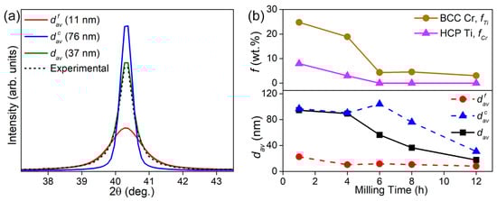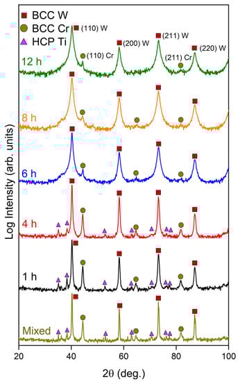 For milling times up to 4 h, and were comparable as the sharper diffraction peaks were dominated by the latter. At 6 h, markedly decreased to ~55 nm and further converged toward of ~17 nm with increased milling time. This shift to the smaller population denotes refinement of the microstructure well into the nanocrystalline regime with the transition occurring between 4 and 6 h of milling. Similar grain sizes as well as bimodal grain size distributions have been reported in the milling of W [25,36] and other BCC metals such as Fe [61]. The Rietveld refinements also provided a quantitative phase analysis given that distinct reflections could be indexed for each constituent, assuming the balance to be BCC W. As shown in Figure 2b, the phase fraction, f, of both minor solute phases, denoted fTi and fCr and for HCP Ti and BCC Cr, respectively, decreased up to 6 h, at which point fCr plateaued to ~5 wt.% while the HCP Ti component was eliminated. We note that our analysis accounted for the minor contributions from the subtle low-angle HCP Ti reflections remaining at 6 and 8 h, and the absence of this shoulder at 12 h confirms Ti dissolved into the BCC W solid solution.