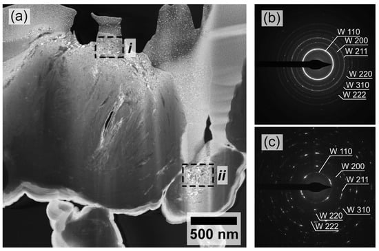 The dual grain size population was further investigated through STEM imaging of the milled powders prepared via FIB milling since initial attempts at finding electron-transparent regions in crushed powders proved unsuccessful. The low magnification STEM dark-field micrograph in Figure 3a reveals a heterogeneous microstructure with two distinguishable regions observed. Certain regions of the powder particles appeared to contain regularly shaped nanocrystalline grains, which was confirmed by the selected area electron diffraction (SAED) pattern shown in Figure 3b acquired from within the region denoted location i. A large number of distinct spots derive from the many small grains simultaneously exhibiting the same crystallographic orientations for each of the respective diffraction rings for BCC W and consistent with a characteristic SAED ring pattern for the nanocrystalline state. A second region of the microstructure is apparent where the grain structure appears deformed, presumably due to plastic flow during the high-energy impact of the media during milling. A SAED pattern acquired on the region denoted location ii is shown in Figure 3c. In contrast to the SAED pattern from location i, fewer spots are present on each diffraction ring, indicative of larger grains, and the intensity distributions suggestive of subtle texturing in this region of the sample [62].