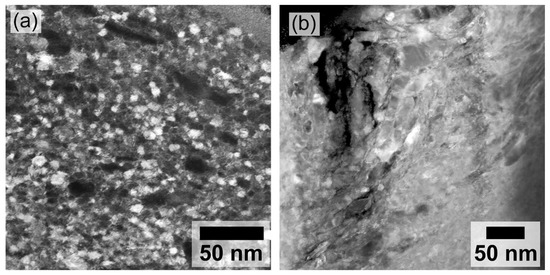 The SAED patterns demonstrate two coexisting microstructures in the milled powders, one containing a fine nanocrystalline grain size and a second with coarser grains and a subtle degree of texturing. Higher magnification imaging of region i shown in Figure 4a confirms the presence of fine equiaxed nanocrystalline grains with sizes in the range of 10–20 nm and consistent with the mean grain size reported from XRD analysis on the 12 h milled powders. The STEM dark-field image in Figure 4b depicts region ii where the grains are elongated and exhibit a wider range of sizes, suggesting this region of the microstructure was still undergoing deformation and grain size refinement later into the milling process. Such microstructures have been observed in milled W powders [63,64,65,66] and, given its transient nature relative to the equiaxed region, will be referred to as the transitional region. The presence of larger elongated grains in the transitional region agreed with the mean sizes of larger grain size population used in producing the sharper peak in Figure 2b for the final fitting function. Additionally, the mean size employed for the small grain size population shown in the same figure were generally consistent with the fine grain size in the equiaxed region. Subtle discrepancies at longer milling times were attributed to the accuracy of convoluting two grain size populations in the fit of a single diffraction peak. The distinct grain size distributions in the equiaxed and transitional regions thus substantiate the use of bimodal grain size distributions for fitting the XRD patterns in Figure 2a. Finally, we note that texturing, as suggested by the SAED patterns, appears to be present in the transitional microstructure but not in the equiaxed regions containing the extremely fine nanocrystalline grains. The evolution of this texture and its implications for grain refinement are explored in the next section.