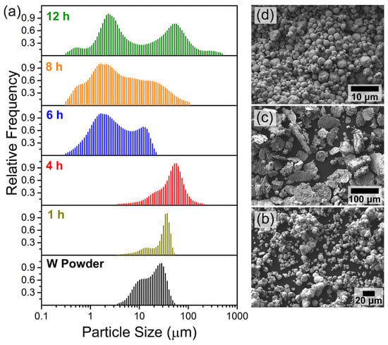 (a) Particle size distributions for the W-10Ti-20Cr powders milled to different times with the size distribution of the starting W powder feedstock shown for reference. Backscatter SEM micrographs of powders (b) mixed and blended prior to milling, then following milling for (c) 4 h, and (d) 12 h. The transitions from faceted to platelet particle morphologies and subsequently from platelet to spherical are evident from (b–d).