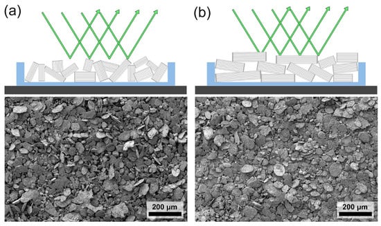 Schematic illustrations and SEM micrographs of the W-10Ti-20Cr powders milled for 4 h and loaded into the XRD sample holder in (a) random and (b) oriented packing configurations. The latter generally aligned the flat particle faces with the incident X-ray beam.