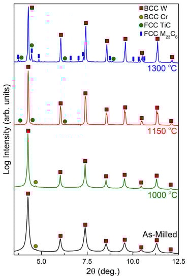 High-energy ball milling was conducted on blended powders (Alfa Aesar, Haverhill, MA, USA) of W (12 μm, 99%), Ti (<44 μm, 99%), and Cr (<10 μm, 99.2) under an argon atmosphere using a Retsch PM 100 planetary ball mill (Retsch, Haan, Germany). A 50 mL tungsten carbide (WC) jar was employed with 5 mm diameter WC balls as the grinding media. Holding the ball-to-powder ratio constant at 5:1, a total of 75 WC balls were loaded into the jar for each run. A stearic acid PCA was used with a concentration of 1% by mass, which facilitated milling at 550 rpm for times of 1, 4, 6, 8, and 12 h with little powder agglomeration following removal from the milling jar. This milling procedure was applied to the W-10Ti-20Cr powder blend with structural characteristics mapped as a function of milling time. Based on these results, W-10Ti-10Cr powder blend was milled for 12 h with thermal stability assessed following heat treatment at 1000 °C, 1150 °C, and 1300 °C for 1 h under a reducing atmosphere using Ar-5%H in an MTI GSL-1600X tube furnace (MTI Corporation, Richmond, VA, USA). Sintering of the as-milled W-10Ti-10Cr powder was accomplished using a LABOX-3010KF Field Assisted Sintering System (SinterLand, Niigata, Japan). A cylindrical graphite die, 13 mm in diameter and lined internally with graphite foil, was loaded with 5 g of powder and placed into the sintering machine under a vacuum (pressure of <10 Pa) where it was subsequently compressed between the platens to a pressure of 50 MPa. The loaded dies were then heated at a rate of 100 °C/min to two different temperatures—1200 °C and 1400 °C—where they held for 5 min before cooling. Following removal from the sintering machine, the sintered samples were sandblasted to remove the graphite foil and any additional surface contamination. The nominally pure W powder used as the feedstock in the milling of the W-Ti-Cr alloys was also sintered in the as-received state following the same sintering procedures and served as a reference for the sintered nanostructure alloy. Density of the sintered samples was determined using the Archimedes method [56] with relative densities determined with respect to theoretical alloy density calculations.