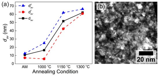 The average grain size of the powders along with the mean size of the two populations employed in fitting the synchrotron XRD patterns are shown in Figure 9a as a function of annealing temperature relative to the as-milled powder. Tracking of the grain size populations used in fitting the diffraction peaks indicated that, up to 1000 °C, coarsening was primarily concentrated with the coarse grain size captured by the trend and consistent with sharpening of the diffraction peaks limited primarily to their centers while broadening was still evident around the bases. From the texture analysis, these regions of the microstructure were still experiencing grain size refinement and mechanical alloying. Consequently, this transient region of the microstructure will contain grain boundaries lean in solute, which, based on the description of a thermodynamically preferred alloy configuration (e.g., by the regular nanocrystalline solution model [33,35]), would represent an unstable part of the microstructure. The grain size of the equiaxed nanocrystalline region of the microstructure retained the as-milled grain size of ~10 nm, which is substantiated in the high magnification STEM darkfield image of the equiaxed nanocrystalline grain structure in Figure 9b. Conversely, at 1150 °C and 1300 °C, grain growth transpired in both the coarse and fine grain size populations, effectively producing an overall increase in the average grain size as captured in the trend and a result of the carbide induced instability mechanism described above. Nevertheless, the ternary nanocrystalline W-10Ti-10Cr alloy was stable up to 1000 °C with an average grain size ~25 nm, while above the recrystallization temperature up to 1300 °C, remained nanostructured albeit with distributed carbides and a larger average grain size.