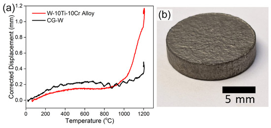 (a) Sintering curves for the nanocrystalline W-10Ti-10Cr powder and CG-W powder with displacement corrected for the thermal expansion of the die and powder charge. The onset of sintering in the nanocrystalline alloy was reduced to ~1000 °C with a sintered bulk sample in (b).