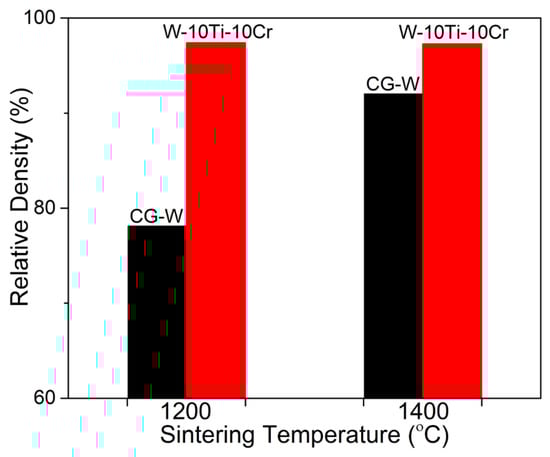 Density of the bulk CG-W and W-10Ti-10Cr alloy for the two isothermal hold temperatures relative to the theoretical value for each sample accounting for the alloy chemistry.