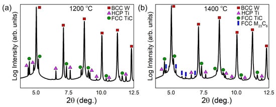 (a) Synchrotron XRD patterns for the W-10Ti-10Cr alloys sintered with isothermal hold temperatures of (a) 1200 °C and (b) 1400 °C. The primary BCC W peaks as well as the secondary HCP Ti, FCC TiC, and FCC M23C6 peaks are indexed in each pattern. Distinct crystallographic reflections are deliberately not included alongside each peak for clarity of presentation.