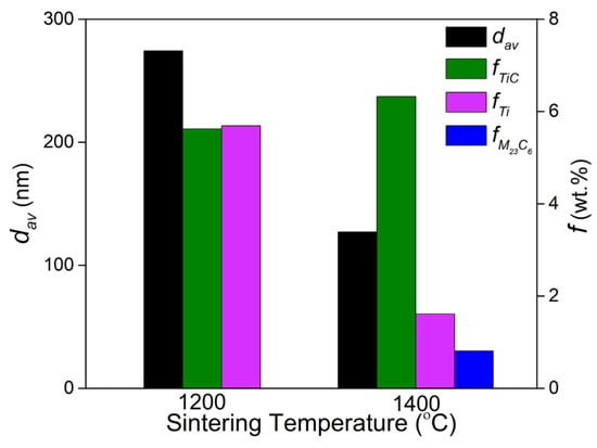 Phase instabilities and the formation of carbides in the bulk alloys were accompanied by a reduction in the degree of peak broadening relative to both the as-milled and annealed powders. Sharper primary BCC W peaks are an indication that grain coarsening transpired during sintering. The resulting mean grain size and phase fractions were quantified through Rietveld refinements that incorporated the HCP Ti, FCC TiC, and FCC M23C6 phases and shown in Figure 13. The initial grain size of the as-milled W-10Ti-10Cr powder of 15 nm coarsened significantly during sintering to 270 and 130 nm at temperatures of 1200 °C and 1400 °C, respectively. While the former grain size is pushing the limitation of XRD for quantifying grain size (even with the higher sensitivity accessible via synchrotron X-rays), it is clear the nanostructure coarsened to a greater extent at 1200 °C. At first glance, this appears counterintuitive since thermal grain growth occurs more rapidly with increasing temperature. However, with nanostructure stability strongly tied to the distribution of Ti in a W-rich alloy, precipitating a larger fraction of the HCP Ti at 1200 °C inevitably competes with the stability of the nanocrystalline grain structure since it draws this solute from the W matrix and presumably the grain boundaries. Enhanced precipitation of Ti at the intermediate sintering temperature of 1200 °C is consistent with predictions of nanophase separation in the binary W-Ti system in this temperature range [36]. The nanostructure thus coarsened to a greater extent at this temperature with a smaller grain size favored at the higher temperature of 1400 °C, thus demonstrating stability and retention of a fine grain structure through sintering of a W-10Ti-10Cr alloy. Finally, we note that the presence of carbides, particularly TiC, has been shown to improve the radiation tolerance of W [83]; however, the reaction of Ti with C during sintering is unfavorable since it leads to instabilities. Future efforts will thus be directed to reducing the amount of C impurities in the milled powders to enhance the retention of the nanocrystalline state in the sintered bulk alloys.