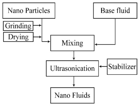 Here m and are the corresponding mass and density of the base fluid (bf) and nanoparticles (np). The stability of the nanofluids should be ensured by controlling pH and zeta potential. Once the nano particles and base fluid are mixed, the whole suspension must be sonicated in a temperature-controlled ultra-sonication system by optimizing the frequency and amplitude of the ultrasonic waves to make stable suspensions. The whole step is shown in Figure 1.