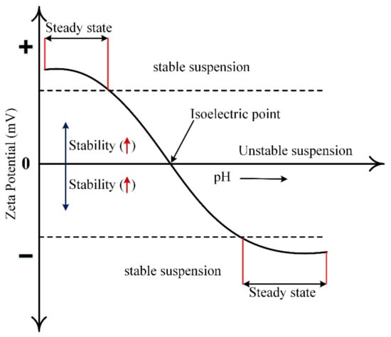 Schematic illustration of a zeta potential vs. pH curve showing the isoelectric point which determines the degree of a nanofluid’s stability.