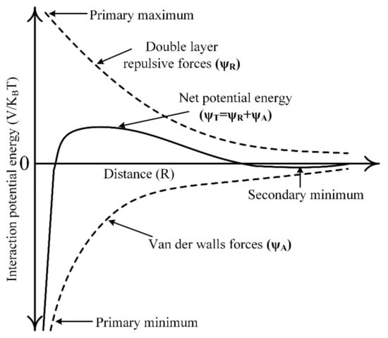 The stability of lyophobic colloids is explained by the theory developed by Derjaguin, Landau, Verwey, and Overbeek (DLVO). [24]. DLVO theory describes the interaction of the local electric field developing around the particles in an aqueous medium. It explains the effect of the van der Waals force (ψA) and electrostatic repulsive force (ψR) between a pair of particles as a function of the distance between them (H). The combination of two forces provides the net interaction energy as shown in Figure 4. Natures of particles and aqueous medium govern the net interaction energy. If two particles possess enough kinetic energy to overcome the maximum repulsive force (energy barrier), they will agglomerate, resulting in an unstable suspension [25]. The total interaction energy, , is a function of the shortest distance between the particle surfaces (H).