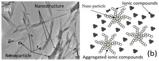 Nanostructures are grown from each nanoparticle and connect each other to form fractal-like fluid nanostructures. (a) TEM image of fractal-like fluid nanostructures formed in a molten salt nanofluids by separated base molten salts; (b) corresponding schematic illustration [37].