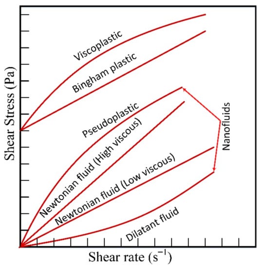 The study of a fluid’s response to the applied shear stress is called rheology [54]. Shear stress versus shear rate gives the rheological behavior of a particular fluid. The ratio of shear stress and strain rate is termed as viscosity, and this determines the rheological properties of a fluid. In general, fluids are categorized into Newtonian and non-Newtonian types. Newtonian fluids exhibit a linear relation between the shear rate and shear stress. While non-Newtonian fluids show a nonlinear relationship, and the fluid flow curve does not intersect the center of the axes of the coordinate system [55]. Figure 6 shows the difference in the fluid flow curves of Newtonian and non-Newtonian fluids. Viscosity is one of the most critical factors determining the stability of a fluid especially in high temperature applications. It also determines the interfacial friction between the fluid layers. To analyze the pumping power requirement in various thermal applications, the rheological behavior of fluid flow must be considered. Many experimental reports showed that the increase in the nanoparticle concentration improved the viscosity of metal oxide-based nanofluids [56,57]. This is because the internal friction between the fluid layers increases with the increase in the viscosity. Table 3 presents the relative viscosity of metal oxide-based nanofluids at several different temperatures.