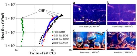 Kim et al. [84] studied the effect of aqueous nanofluids composed of alumina, zirconia and silica nanoparticles on nucleate boiling. The volume fraction of nanoparticles varied from 0.001 to 1.0% by volume. Pool boiling studies were performed on stainless steel grade 316. Significant improvements of up to 200% in critical heat flux (CHF) were observed using the various nanoparticles shown in in Figure 7a. The wettability of fluid with the SS316 wire was observed to increase with the addition of nanoparticles. As shown in Figure 7b,d, vapor bubbles were uniformly distributed on the heater surface and CHF increased. Sarafraz et al. [79] conducted experiments on pool boiling heat transfer around a stainless steel cylindrical surface in aqueous nanofluids varying the CuO particle fraction from 0.1 to 0.4 wt.%. Sodium deodecyl sulphide solution of 0.1% was added for steric stabilization, and HCl + NaOH buffer solution was added for electrostatic stabilization to change the pH. They have reported a decrease in pool boiling heat transfer coefficient due to the deposition of nanoparticles on the heat transfer surface. Many researchers have observed the enhancement in critical heat flux during pool boiling heat transfer for all nanofluids [85]. This is because the surface tension decreases due to the increase in wettability and the surface roughness decreases due to the deposition of nanoparticles in the micro cavity around the heating section.