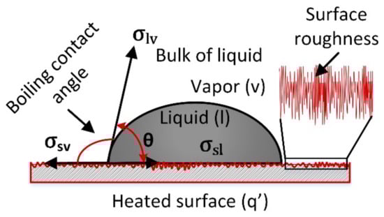 where r is the roughness ratio, i.e., the ratio between actual and projected surface area. Figure 8 presents the schematic illustration of nucleate boiling contact angle according to Wenzel.