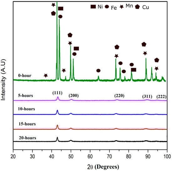 Figure 1 depicts the XRD patterns of the as-milled alloy powders at a time interval of 5 h during the mechanical milling. After 5 h of mechanical milling, the peaks of the individual starting elemental powder disappeared completely and only the principal diffraction peaks at 2θ values 42.8°, 49.7°, 73.19°, 88.6°, and 94.2° could be seen. These peaks were indexed as (111), (200), (220), (311), and (222) and correspond to a single phase FCC structure. When continuing milling the powders for times extending to 10, 15, and 20 h, the principal diffraction peaks of FCC crystal structure remained unchanged. This implied that the NiMnFeCu HEA forms after 5 h of milling. This phenomenon is attributed to the dissolution of the starting elements and formation of the solid solution [37]. Continuous milling to extended times of 10, 15, and 20 h caused no further change in the diffractions peaks, which suggests that there was no further phase change. It is reasoned that the formation of the FCC phase in the studied NiMnFeCu HEA could be due to the presence of excessive FCC forming elements, as it is reported elsewhere that the alloying elements could be grouped into two categories, one being the FCC forming elements such as Cu, Ni, Co, and Mn, and the other being the BCC forming elements, such as Al, Cr, W, Fe, and V [38]. In addition to the calculated VEC of NiMnFeCu being 9, as discussed in the Section 3.1, this factor also resulted in the formation of the FCC structure in the studied HEA.