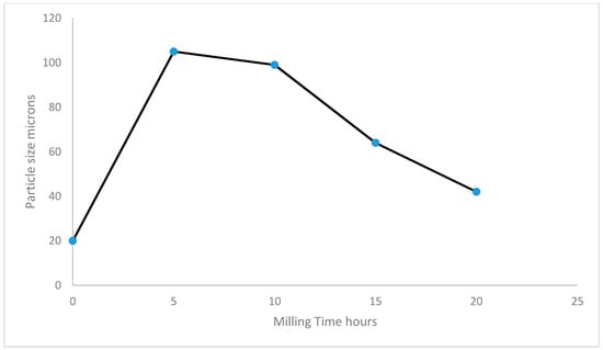Figure 2a–d shows the SEM images of the raw elemental powders and Figure 2e–h shows the SEM images of the as-milled powders at various times. It was observed that the raw elemental powders have varied morphology (Mn—irregular shape, Cu—dendritic shape, Ni and Fe—spherical shape). After milling for 5 h, the morphology of the as-milled powders showed irregular shapes and the powder particle size was observed to be about 105 microns (D50). After prolonging the milling time to 10, 15, and 20 h, the morphology of the as-milled HEA NiMnFeCu remained unchanged, however the particle size changed dramatically. With an increase in the milling time, the particle size of the as-milled powders decreased continually, with a value of 99.3 microns (D50) observed for the 10 h as-milled powders, 73.2 microns (D50) for the 15 h as-milled powders, and 42 microns (D50) for the 20 h as-milled powders, respectively. The variation of the powder particle sizes for the as-milled powders with milling time is presented in Figure 3 (the average particle size of the starting powders is about 20 microns (D50).