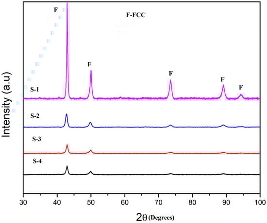 Figure 5 shows the XRD patterns of the as-sintered NiMnFeCu under various sintering conditions (S1–S4). Table 3 summarises the details of the sintering conditions. It is clearly seen that the as-sintered alloys (S1–S4) at all conditions consist of a single FCC HEA phase. This suggests that during the sintering process, no phase transformation takes place.