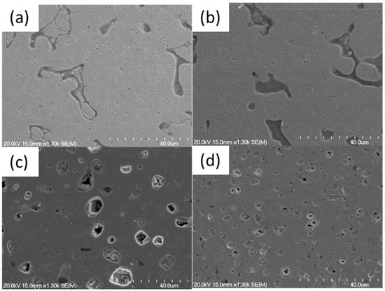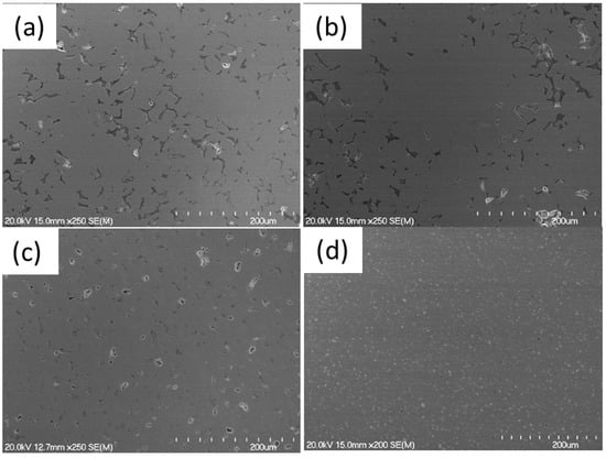 SEM images of the as-sintered NiMnFeCu under low magnification. (a) At 1000 °C for 1 h (S1), (b) at 1000 °C for 2 h (S2), (c) at 1050 °C for 1 h (S3), (d) at 1050 °C for 2 h (S4).