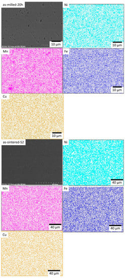 SEM/EDS mapping of the as-milled NiMnFECu powders at 20 h and as-sintered NiMnFeCu alloy at conditions S2 (sintering at 1000 °C for 2 h).